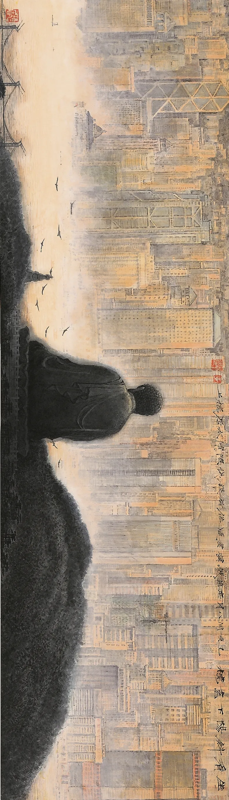 黄孝逵 坐看斜陽下高樓 水墨畫138cm×40cm