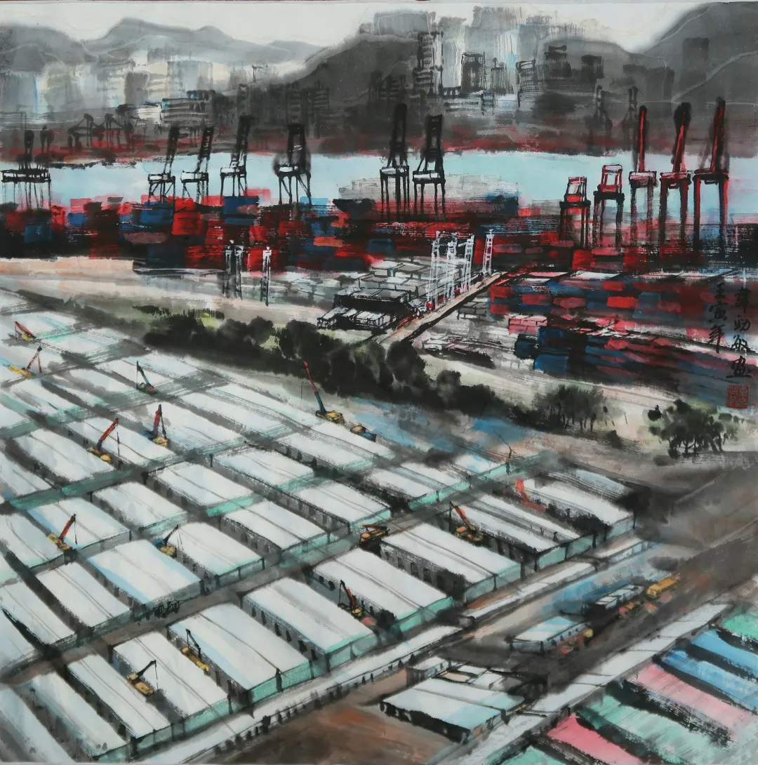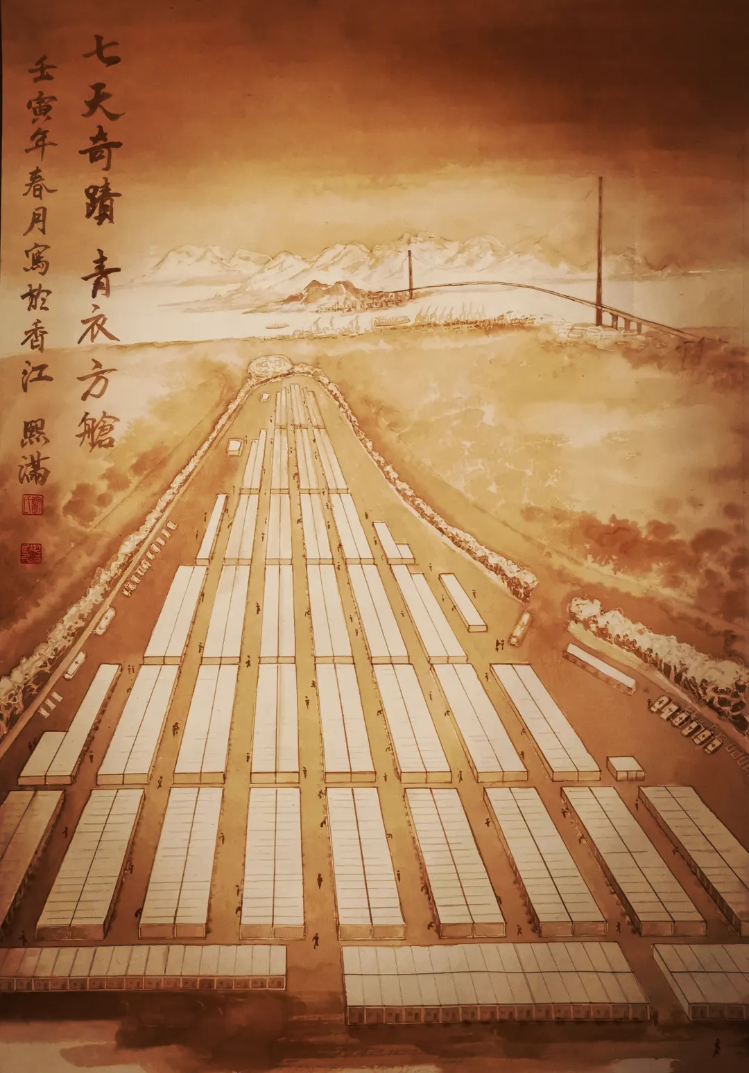 韋勁敏 建設中的青衣方艙醫院 水墨畫68cm×68cm
